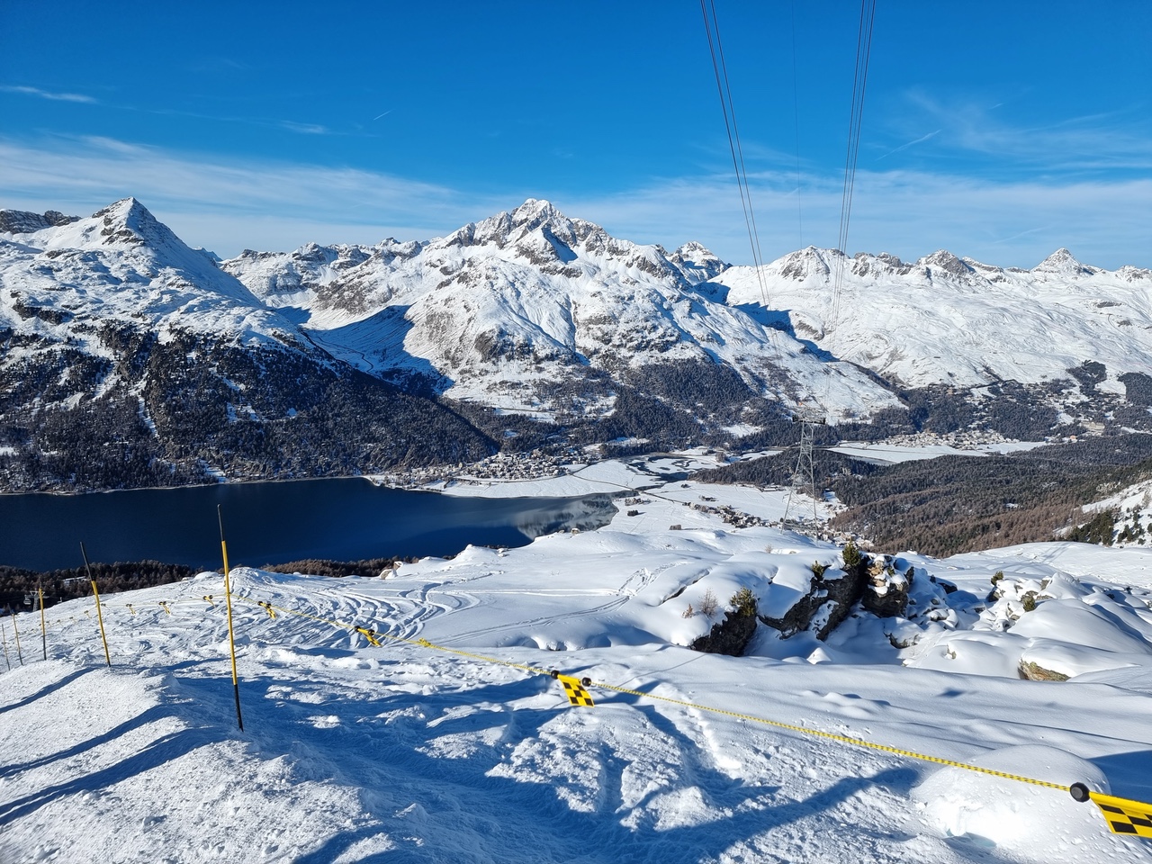 Прямо от нашего отеля наверх поднималась кабинка ски-лифта Corvatsch, откуда можно было дальше удобно обследовать всю зону катания. Трассы в основном красные. Очень красивые виды сверху на долину и озеро. Катались много и с удовольствием, с короткими остановками на глинтвейн.