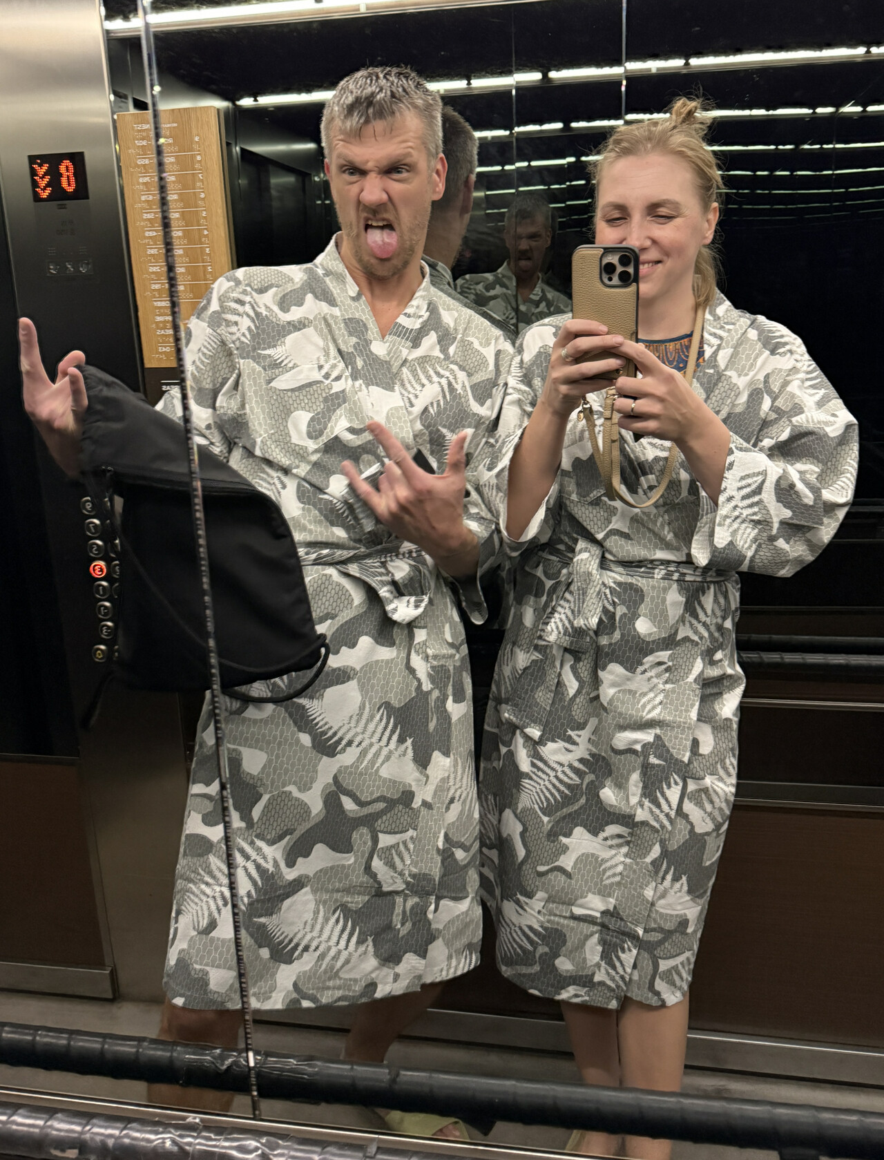 Мы прилетели уже вечером, но программа предстояла довольно обширная: отдохнуть, поесть, погулять. На крыше нашего отеля располагался спа-комплекс с открытым бассейном с подогревом и прекрасным видом на панораму города. Однако, чтобы туда проникнуть, пришлось в банных халатах проследовать через весь отель, подняться на лифте, а потом - через оживлённый бар наверху :)